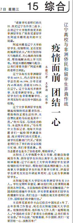 辽宁各高校有非洲籍留学生6659人,约占留学生在学总数的46.19%,分布在省内43所高校,目前有3370人在辽宁。辽宁各高校多措并举,关爱非洲留学生。非洲留学生们也非常理解学校,并用实际行动支持中国抗击疫情。