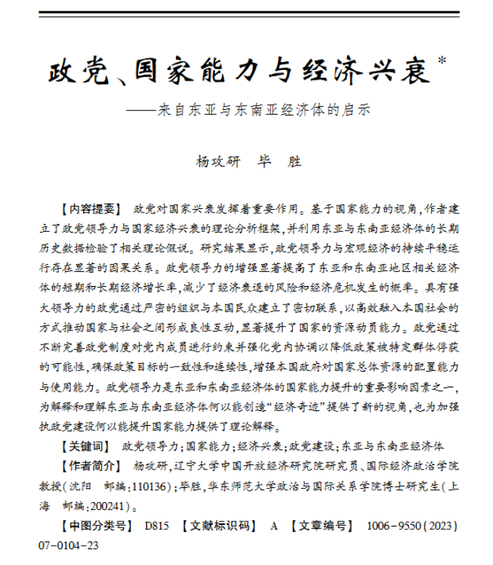 国际经济政治学院杨攻研教授第一作者的学术论文“政党、国家能力与经济兴衰”发表于《世界经济与政治》2023年第7期。