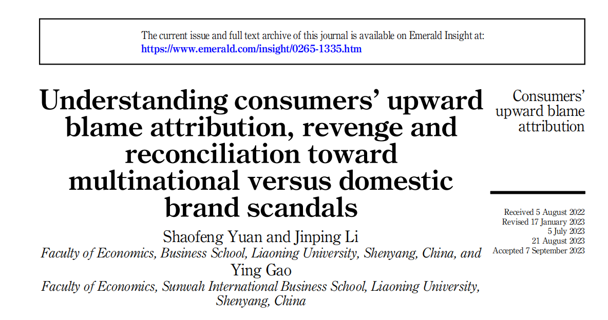 商学院袁少锋教授、硕士研究生李金苹与新华国际商学院高英副教授合作完成的论文“Understanding Consumers’ Upward Blame Attribution, Revenge and Reconciliation toward Multinational versus Domestic Brand Scandals”于2023年9月23日在国际期刊International Marketing Review发表。